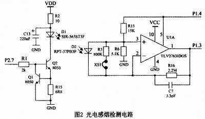 煙霧檢測(cè)方式主要有離子感煙探測(cè)和光電感煙探測(cè)。離子感煙探測(cè)對(duì)電路和工藝要求高,探測(cè)器受濕度和氣流等影響大,維護(hù)費(fèi)用高于制造費(fèi)用。本文采用光電感煙探測(cè)方式,電路如圖2所示。采用特制的光學(xué)迷宮作為煙霧接收裝置,內(nèi)裝有紅外發(fā)射二極管(IRdiode)和紅外接收二極管(IR receiver),主控芯片MSP430F2012的P2.7口定期驅(qū)動(dòng)紅外發(fā)射部分發(fā)射紅外線,若有煙霧進(jìn)入光學(xué)迷宮,則產(chǎn)生光的散射,紅外接收二極管接收光信號(hào)后產(chǎn)生電流信號(hào),經(jīng)運(yùn)算放大器LM358轉(zhuǎn)換為電壓信號(hào),送入主控芯片ADC模塊通道A3進(jìn)行采樣轉(zhuǎn)換,當(dāng)判斷迷宮內(nèi)出現(xiàn)煙霧后,主控芯片驅(qū)動(dòng)壓電蜂鳴器發(fā)出煙霧報(bào)警聲音。