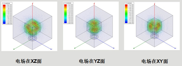 傳統(tǒng)的單模介質(zhì)濾波器在單腔中產(chǎn)生一個諧振模,三模濾波器在單腔中產(chǎn)生三個相互獨(dú)立的諧振模介質(zhì)多模技術(shù),是利用介質(zhì)諧振器本身的結(jié)構(gòu)對稱性,在一個單腔里 面產(chǎn)生三個相互正交的諧振模式及三個帶外傳輸零點(diǎn)。所采用介質(zhì)材料具有高Q值,高頻率精度及高溫度穩(wěn)定性。圖一是多模單腔的模型和頻率仿真結(jié)果,圖二是三種模式的場分布。