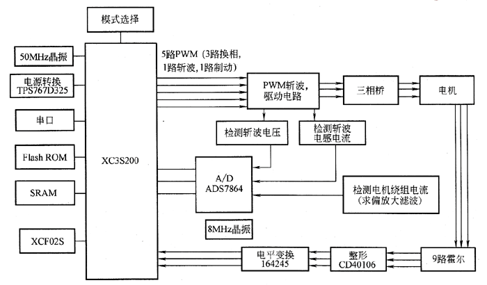 電路由電源模塊,電壓轉(zhuǎn)化模塊,F(xiàn)PCA模塊,驅(qū)動電路模塊,斬波電流、電壓檢測模塊,繞組電流檢測模塊,A/D模塊,通信模塊,外擴存儲器模塊等部分組成。