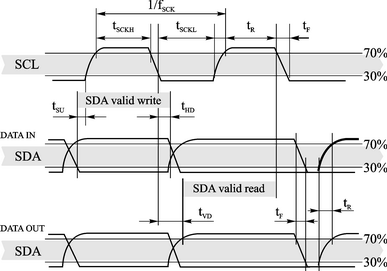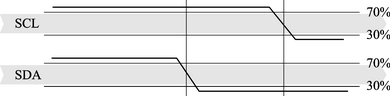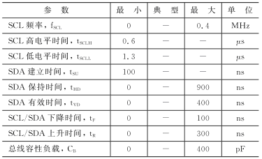 表1 I2C總線快速模式數(shù)字輸入/輸出端的時(shí)序特性