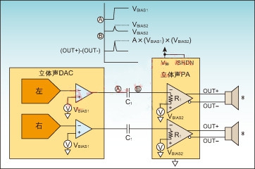圖2:大尺寸耦合電容以及輸入、輸出偏置電壓共同導(dǎo)致?lián)P聲器子系統(tǒng)的咔嗒聲。