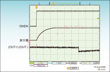 設(shè)置開啟時(shí)間時(shí),IC設(shè)計(jì)工程師必須考慮放大器的輸入阻抗以及輸入偏置電壓和輸入偏置電容,輸入電容由應(yīng)用工程師選擇,以提供快速響應(yīng)的時(shí)間常數(shù)并保證低頻響應(yīng)盡可能平坦為目標(biāo)。圖3的測(cè)試波形表明/SHDN引腳拉高后,輸入偏置電壓爬升到正常值,延遲tON并激活輸出端。如果在此過程中,被激活的輸出平穩(wěn)開啟,揚(yáng)聲器不會(huì)發(fā)出咔嗒聲。