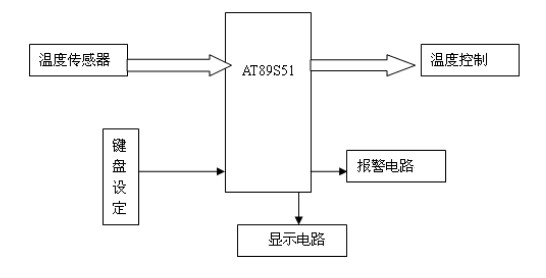溫度控制器系統(tǒng)包括以下幾個主要部分:溫度傳感器,報警電路,LED顯示電路,鍵盤控制,89C51控制部分。如圖所示: