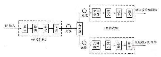 前端合成的多路電視射頻信號(hào),通過(guò)電纜連接頭送入光發(fā)射機(jī),光發(fā)射機(jī)將射頻信號(hào)送入光源驅(qū)動(dòng)電路放大并驅(qū)動(dòng)光源,把射頻信號(hào)調(diào)制在光載波上成為光調(diào)制信號(hào),并經(jīng)光纖連接器送入光纜。在光接收端,光信號(hào)由光分路器和光纖連接器傳送到光接收機(jī),光接收機(jī)通過(guò)光/電轉(zhuǎn)換,將光纜傳送來(lái)的光信號(hào)解調(diào)還原為原來(lái)的射頻調(diào)制信號(hào),連接上同軸電纜分配網(wǎng)絡(luò),把電視信號(hào)分配給電視用戶。