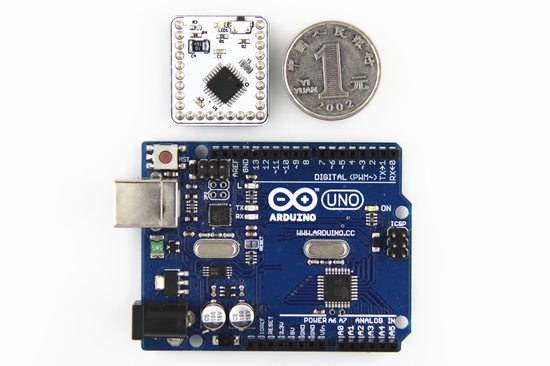 你可以將Femtoduino看成是一個(gè)小型化的Arduino,重量?jī)H兩克。它采用Arduino的編譯器以及相對(duì)應(yīng)的庫(kù)。而且與Arduino UNO一樣,F(xiàn)emtoduino也以ATMega 328p為核心。不過(guò)特別遺憾的是,它沒(méi)有USB接口。所以在2013年初,他們推出帶有USB的新版Femtoduino。預(yù)計(jì)在今年1月19日,他們會(huì)發(fā)布集成Bluetooth 4.0和USB的Femtoduino,售價(jià)60美刀。新版本仍然采用ATMega 328p-MU,只是體積稍微增大了一些。