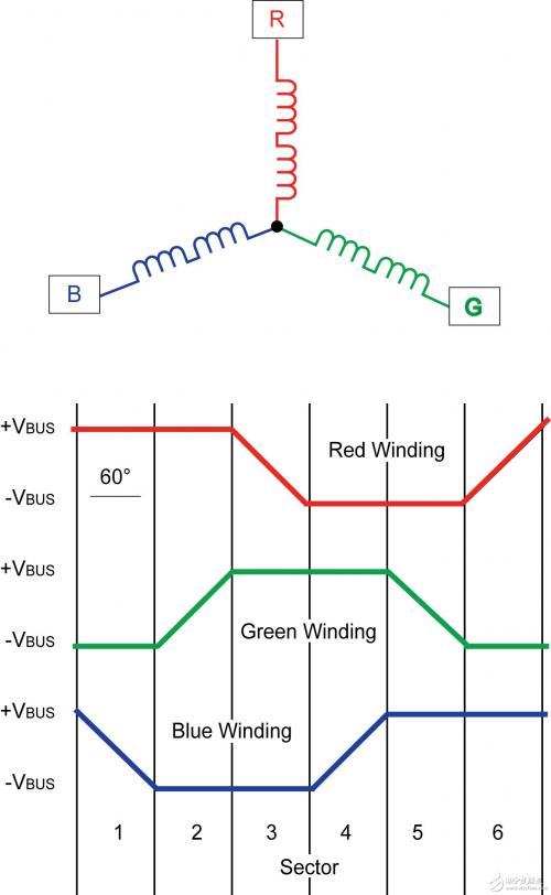 依靠傳感器的運(yùn)行實(shí)現(xiàn)起來(lái)非常容易,但除去傳感器可降低系統(tǒng)成本并提高可靠性。為了理解無(wú)傳感器算法如何計(jì)算轉(zhuǎn)子位置,我們進(jìn)一步了解一下BLDC電機(jī)的三個(gè)相。
