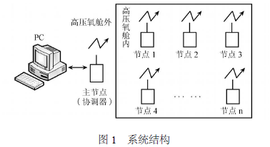 小封裝、低功耗、無線通信、安全性和互操作是醫(yī)療可穿戴式監(jiān)護(hù)設(shè)備設(shè)計(jì)的基本要求。本文所設(shè)計(jì)的生命特征監(jiān)護(hù)設(shè)備的系統(tǒng)結(jié)構(gòu)如圖1所示。系統(tǒng)主要由監(jiān)護(hù)PC主機(jī)、艙外主節(jié)點(diǎn)(coor—dinatornode)和艙內(nèi)的多參數(shù)采集傳感器子節(jié)點(diǎn)(sensornodes)等三個(gè)部分組成,主節(jié)點(diǎn)和各子節(jié)點(diǎn)之間通過IEEE802.15.4無線通信協(xié)議構(gòu)成一套結(jié)構(gòu)簡單、工作穩(wěn)定,運(yùn)行可靠的星型無線通信網(wǎng)絡(luò)。