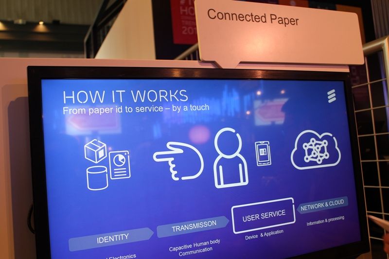 MWC展會上愛立信將這項技術(shù)應用于紙質(zhì)飲料杯,想感受紙聯(lián)網(wǎng),體驗者只需一邊手持飲料杯,另一手觸摸連接平板電腦的“人體互聯(lián)”感應裝置,就可以了解到飲料的成分、卡路里數(shù)值,飲料運輸方式和運輸距離等信息。愛立信將這種技術(shù)稱為“紙聯(lián)網(wǎng)”,紙只是作為被讀取的目標存在,任何包含印刷電路的的物質(zhì)都能成功的被讀取。紙聯(lián)網(wǎng)成為MWC2014一道特別的風景線。