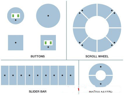 電容式觸摸傳感器以類似圖1所示的按鈕、滑動(dòng)條、滾輪或其他方式提供一種用戶界面。