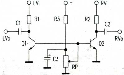 該電路是靠調(diào)節(jié) Q1 、 Q2 的導(dǎo)通度來(lái)控制音量的。 Q1 、 Q2 的基極并聯(lián)在一起,當(dāng)調(diào)節(jié) RP 時(shí), Q1 、 Q2 的偏壓會(huì)發(fā)生變化,其導(dǎo)通度也會(huì)隨之改變,從而使輸出電壓發(fā)生變化,達(dá)到調(diào)節(jié)音量的目的。在這里 Q1 、 Q2 、 R1 、 R2 就相當(dāng)于一個(gè)雙聯(lián)電位器,調(diào)節(jié) RP 就可控制兩個(gè)聲道的輸出。這樣就實(shí)現(xiàn)了用單電位器控制雙聲道音量的目的。 R3 、 C3 是限流濾波電路,防止電源電壓波動(dòng)或突變時(shí)影響到 Q1 、 Q2 的偏壓,否則會(huì)有噪聲串入音頻信號(hào)。
