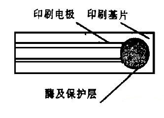 便攜式智能血糖測試儀采用一次性使用的葡萄糖氧化酶印刷電極(下簡稱酶電極) 作為傳感器,酶電極的結(jié)構(gòu)如圖1所示。