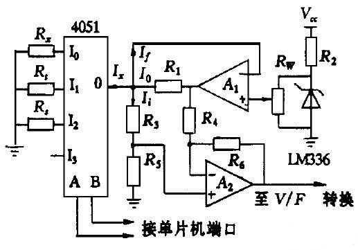 便攜式智能血糖測試儀的硬件由89C51單片機芯片、液晶顯示器、V / F 變換器、恒電位測量電路、多路轉(zhuǎn)換開關(guān)、溫度電阻、標準電阻、電源電壓監(jiān)測和電池等部分組成。圖3 所示為恒電位測量電路的原理圖,Rx 代表酶電極。電壓基準源LM336 提供的2. 5V 電壓經(jīng)過分壓后獲得0. 4V 工作電壓, 經(jīng)電壓跟隨器對酶電極進行恒電位激勵;根據(jù)運算放大器的特性, If ≈ Io≈0 , 則響應(yīng)電流I x ≈ Io ; 該電流信號由取樣電阻R1 獲得,經(jīng)差動放大為0~2. 5V 的電壓信號送V / F 變換器。
