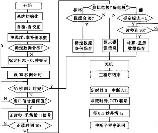 圖4 所示為便攜式血糖測量儀的系統(tǒng)程序流程圖,89C51 的定時器0 工作在定時中斷方式, 其中斷服務(wù)程序完成系統(tǒng)時鐘、LCD 驅(qū)動、讀V / F 結(jié)果等工作。定時器1工作在計數(shù)方式,在定時器0 的控制下測量V / F 輸出的頻率信號。主程序按本文第一節(jié)所述的方法和步驟實現(xiàn)整個測量過程, 其中采用了一些基本的智能化技術(shù),如:自動補償、信息的自動識別、測量的可信度評價等。