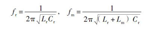 由于增加了一個諧振電感,LLC諧振電路具有兩個諧振頻率,一個是諧振電感Lr和諧振電容Cr的諧振頻率fr,另一個是Lm加上Lr與Cr的諧振頻率fm。計算公式如下: