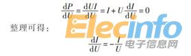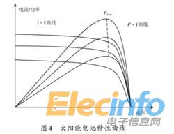 目前常用的最大功率跟蹤算法主要有恒定電壓跟蹤法、擾動觀察法、電導(dǎo)增量法等幾種,其中電導(dǎo)增量法以優(yōu)良的跟蹤性能倍受青睞。下面簡單介紹其工作原理。圖4是太陽能電池特性曲線圖。由圖可以看出,在最大功率點的時候功率曲線斜率為0,即功率P對電壓V的導(dǎo)數(shù)為0,所以有dPdU =0,又因為P=UI,所以: