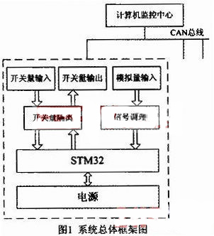 系統(tǒng)總體設(shè)計(jì)框圖如圖1所示。本設(shè)計(jì)采用ST公司生產(chǎn)STM32F103RCT6作為系統(tǒng)的主處理器。STM32系列基于專(zhuān)為要求高性能、低成本、低功耗的嵌入式應(yīng)用專(zhuān)門(mén)設(shè)計(jì)的ARM Cortex-M3內(nèi)核,它集成了兩個(gè)CAN控制器,并為每個(gè)CAN控制器分配了256字節(jié)的SRAM,每個(gè)CAN控制器有3個(gè)發(fā)送郵箱和兩個(gè)接收FIFO。它主要負(fù)責(zé)采集、處理開(kāi)關(guān)量和模擬量輸入,控制開(kāi)關(guān)量輸出,同時(shí)通過(guò)CAN總線完成與上位機(jī)的通信。