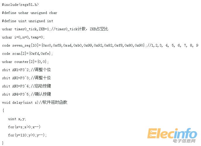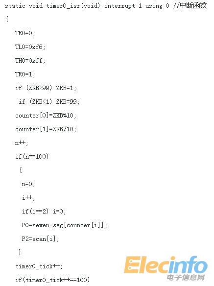 關(guān)于頻率和占空比的確定,對于12M晶振,輸出頻率為1KHZ,這樣定時中斷次數(shù)設(shè)定為10,即0.01MS中斷一次,則TH0=FF,TL0=F6;由于設(shè)定中斷時間為0.01ms,這樣可以設(shè)定占空比可從1-99%變化。即0.01ms*100=1ms。