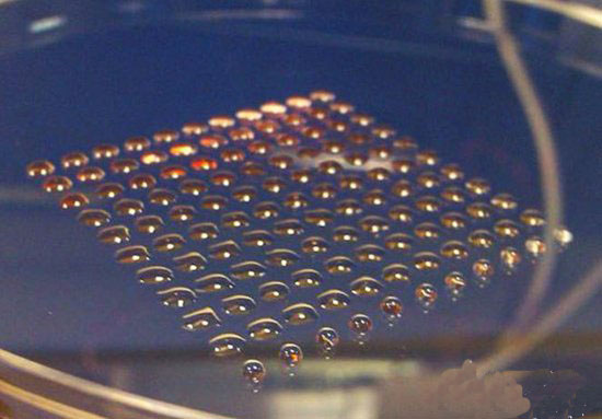 這篇報(bào)告由英國(guó)牛津大學(xué)的黑根·貝利教授及其同事聯(lián)名發(fā)表。據(jù)介紹,他們利用3D打印機(jī)分層次噴出大量被脂類薄膜包裹的液滴,這些液滴形成網(wǎng)狀結(jié)構(gòu),構(gòu)成特殊的新材料。