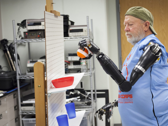 【機(jī)器手臂】2014年5月,美國食品及藥物管理局(FDA)批準(zhǔn)了一種機(jī)械手臂。在《星球大戰(zhàn)2:帝國反擊戰(zhàn)》中,失去一條胳膊的盧克天行者就獲得了一只完美的仿生手臂。2014年12月,約翰霍普金斯醫(yī)學(xué)院的醫(yī)生為這位雙臂截肢的老人裝上了一雙可以由大腦操縱的機(jī)械手臂。