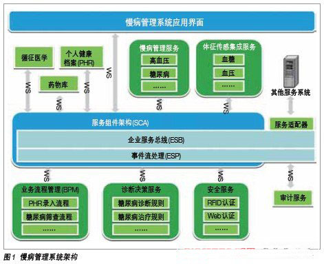 系統(tǒng)的通用組件包括了企業(yè)服務(wù)總線、事件流處理、服務(wù)組件架構(gòu)、業(yè)務(wù)流程管理、診療決策服務(wù),這5個組件都有相應(yīng)的軟件實現(xiàn),慢病管理系統(tǒng)只是將其進行了整合,以實現(xiàn)SOA架構(gòu)。其中企業(yè)服務(wù)總線、事件流處理、服務(wù)組件架構(gòu)是SOA架構(gòu)的基礎(chǔ)。企業(yè)服務(wù)總線用于集成不同的應(yīng)用,它所提供的服務(wù)適配器可以讓慢病系統(tǒng)和其他服務(wù)系統(tǒng)( 如HIS、電子病歷等)進行集成,從而解決了與其他醫(yī)療信息系統(tǒng)如何進行數(shù)據(jù)交互的問題。事件流處理用于監(jiān)測系統(tǒng)中發(fā)生的所有事件,并對發(fā)生的事件進行相應(yīng)的處理,主要用于數(shù)據(jù)的實時分析、統(tǒng)計,可以用于審計工作。服務(wù)組件架構(gòu)則用于將各種Web 服務(wù)整合,重新封裝為合適的組件服務(wù),通過這一技術(shù),可以容易將系統(tǒng)擴展為分布式服務(wù)。同時,對于服務(wù)使用者而言,這種擴展是完全透明的,可實現(xiàn)“服務(wù)云”的功能,而該技術(shù)最大的好處是不需要花大量的資金來創(chuàng)建“云計算”基礎(chǔ)架構(gòu)就可以提供相似的功能。業(yè)務(wù)流程管理、診療決策服務(wù)用于可視化的創(chuàng)建慢病管理流程和診療決策,并將創(chuàng)建結(jié)果即時應(yīng)用于系統(tǒng)中。由于系統(tǒng)開發(fā)人員往往無法真正了解醫(yī)療方面的內(nèi)容,使用這兩個組件便可以讓醫(yī)生參與到系統(tǒng)的設(shè)計中來,真正滿足醫(yī)生的業(yè)務(wù)需求,從而提高系統(tǒng)的實用性和靈活性。