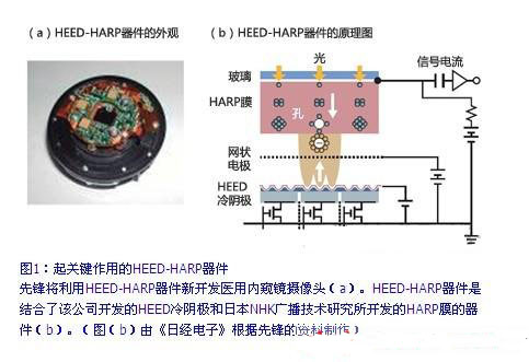 先鋒打算通過在內(nèi)窺鏡攝像頭中采用“HEED-HARP”技術(shù),以實現(xiàn)與其他公司產(chǎn)品的大幅差異化(圖1)。HEED-HARP結(jié)合了該公司開發(fā)的冷陰極型平面電子源“HEED”(highefficiency electron emission device)和日本NHK廣播技術(shù)研究所主導(dǎo)開發(fā)的超高靈敏度光電轉(zhuǎn)換膜“HARP”(high-gain avalanche rushing amorphous photoconductor)。