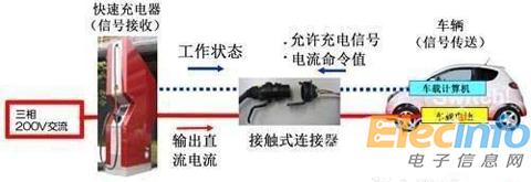 CHAdeMO采用的快速充電方式如圖所示,電流受控于汽車的CAN總線信號(hào)。即在監(jiān)視電池狀態(tài)的同時(shí),實(shí)時(shí)計(jì)算充電所需電流值,通過通訊線向充電器發(fā)送通知;快速充電器及時(shí)接收來自汽車的電流命令,并按規(guī)定值提供電流。