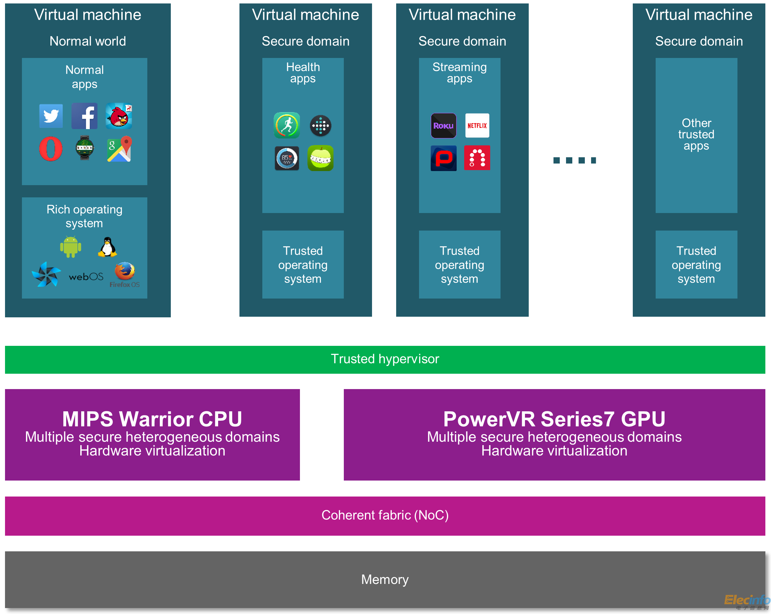 作為一項可伸縮的安全技術(shù),Imagination的OmniShield可確保需要安全的應(yīng)用有效并且可靠的彼此隔離,避免非安全應(yīng)用的干擾,同時還能滿足功能、性能、成本和功耗的需求。OmniShield超越了傳統(tǒng)的二元方法,能建立多個安全域(secure domain),讓每個安全、非安全的應(yīng)用程序及操作系統(tǒng)能在獨立的環(huán)境中運作。例如,DRM和支付系統(tǒng)等安全進(jìn)程能與游戲和網(wǎng)頁瀏覽等非安全進(jìn)程共存。