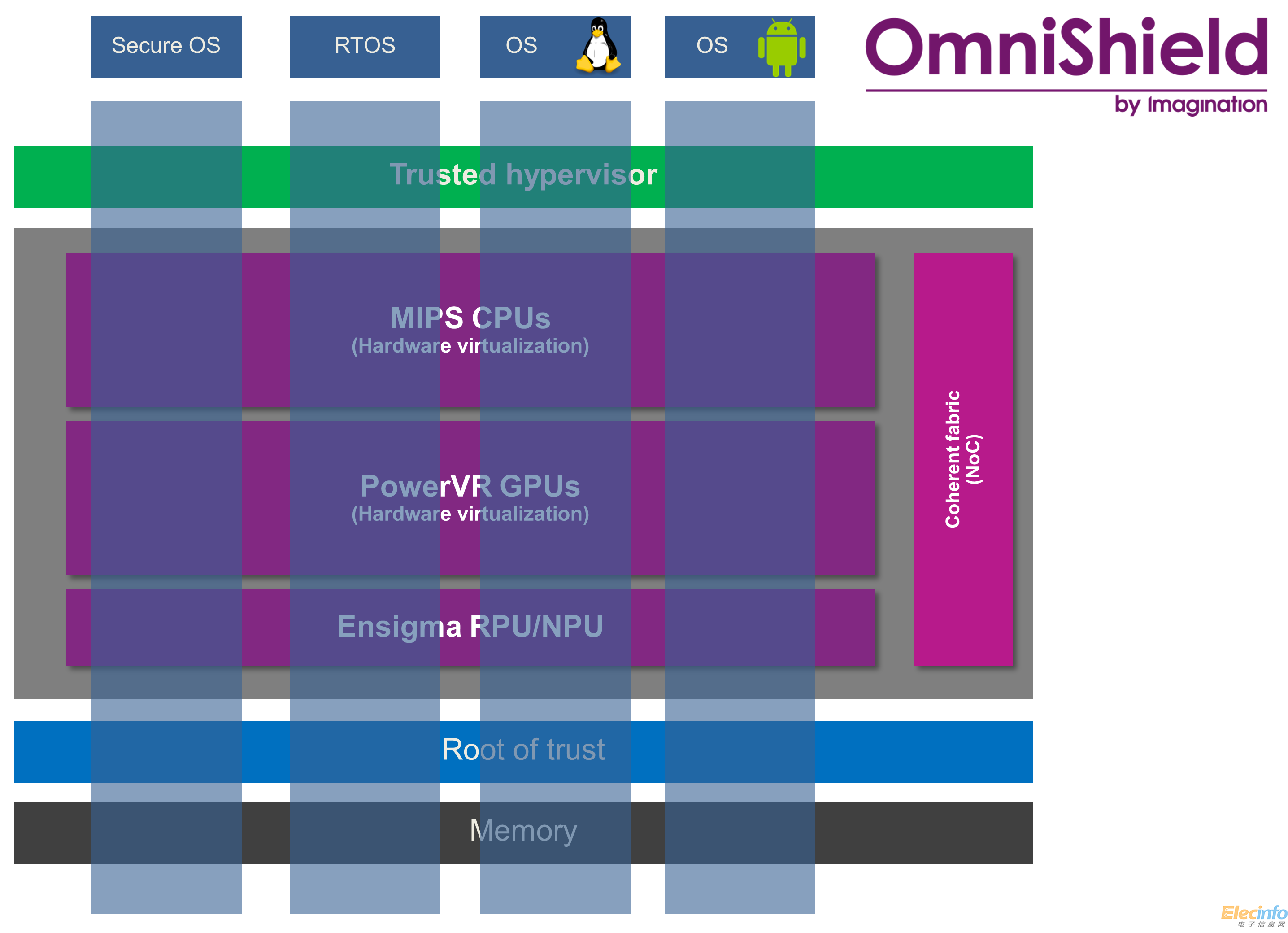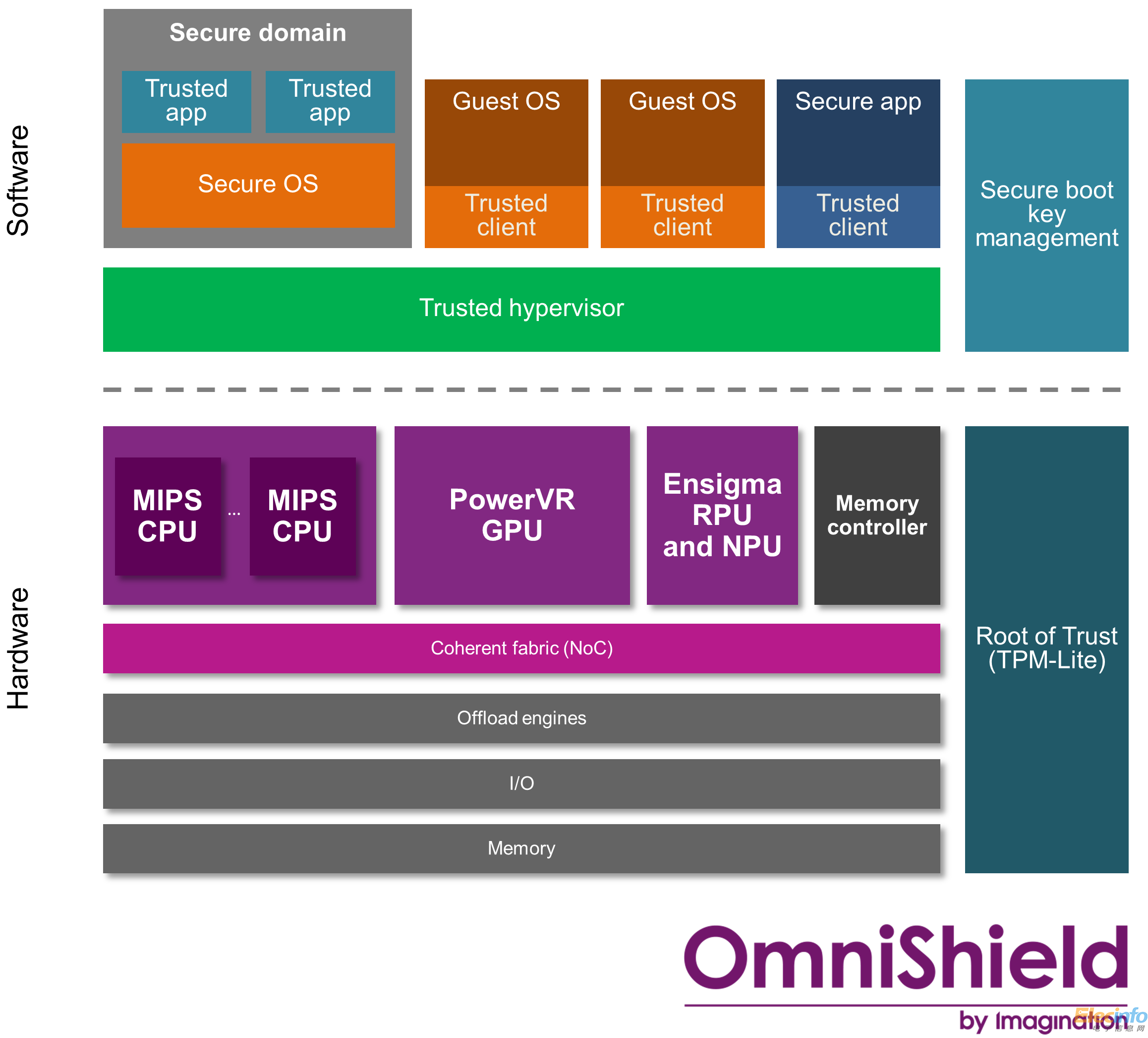 Imagination正將OmniShield支持納入其全系列處理器產(chǎn)品中,包括MIPS Warrior CPU、PowerVR多媒體處理器以及Ensigma處理器。Imagination的處理器專為在異構(gòu)、一致性集群中運作所設(shè)計——這些集群通過可伸縮的安全互連結(jié)構(gòu)連結(jié)在一起,并利用由可信任的監(jiān)管程序控制的安全流將OmniShield遍及整個SoC。此外,Imagination與其合作伙伴將為OmniShield提供更多樣的虛擬化Root-of-Trust IP模塊,包括密碼(crypto)、公鑰加速器、真正的隨機(jī)數(shù)發(fā)生器、外部TPM的安全I(xiàn)/O以及安全ROM。