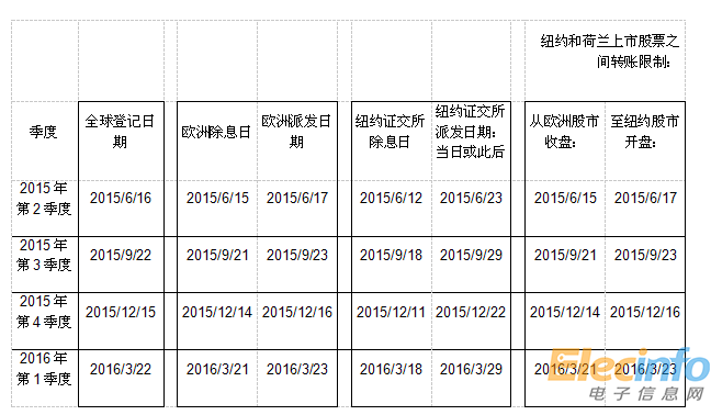* 由于股東大會(huì)的召開(kāi)時(shí)間是2015年5月27日,公司將無(wú)法在五月按照正常時(shí)間表于第一期分紅除息日完成派發(fā),因此,通過(guò)與證交所協(xié)調(diào),為了確保其股票可在市場(chǎng)上正常運(yùn)行,歐洲派發(fā)日改為2015年6月17日,除息日為2015年6月15日。除上表特別規(guī)定外,隨后分期分紅的除息日/派發(fā)日與正常時(shí)間表一致。