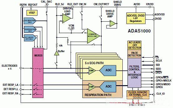 ADAS1000能夠測量心電圖(ECG)信號、胸阻抗、人工起搏信號、導聯(lián)連接/脫落狀態(tài),并將此信息以數(shù)據(jù)幀的形式輸出,以可編程數(shù)據(jù)速率提供導聯(lián)/矢量或電極數(shù)據(jù)。它具有低功耗和小尺寸特性,適合電池供電的便攜式應(yīng)用。它還是一款高性能器件,因此適用于高端診斷設(shè)備。