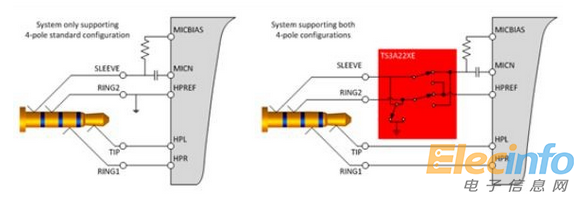 由于此前國際上所使用的有線頭戴式耳機(jī)的音頻插孔都是標(biāo)準(zhǔn)的3.5mm連接器,然而伴隨著該行業(yè)的發(fā)展,更多的高級(jí)音頻娛樂環(huán)境系統(tǒng)逐步實(shí)現(xiàn)了需要一個(gè)傳聲器輸入的按鍵和話音命令功能。這樣一來,工程師所設(shè)計(jì)的音頻插孔開關(guān)系統(tǒng)就必需支持具有一個(gè)尖端、兩個(gè)環(huán)和套筒銷的四芯插孔。如何解決音頻插孔開關(guān)與頭戴式耳機(jī)、話筒兼容的問題,就成為了眾多企業(yè)所棘手的問題。