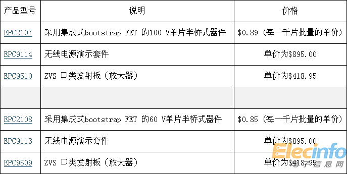 全新EPC2107及EPC2108 eGaN功率集成電路包含單片半橋式器件及集成式自舉功能,專為符合無線充電聯(lián)盟(A4WP)第二及第三級規(guī)范的解決方案而設(shè)。此外,為了讓客戶容易對氮化鎵元件進行評估,我們也提供開發(fā)板及包含發(fā)射器及接收器的無線電源傳送解決方案。