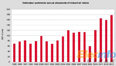根據(jù)國際機器人聯(lián)盟(IFR)2014年統(tǒng)計顯示,2013年機器人出貨量增長12%,成長至178,132臺,如圖1所示,工業(yè)機器人持續(xù)在汽車、化工、橡膠、塑料等行業(yè)以及食品行業(yè)增加;2008年至2013年,中國的工業(yè)機器人每年總供應量平均增加36%,并且可促使該國成為世界最大的機器人市場。