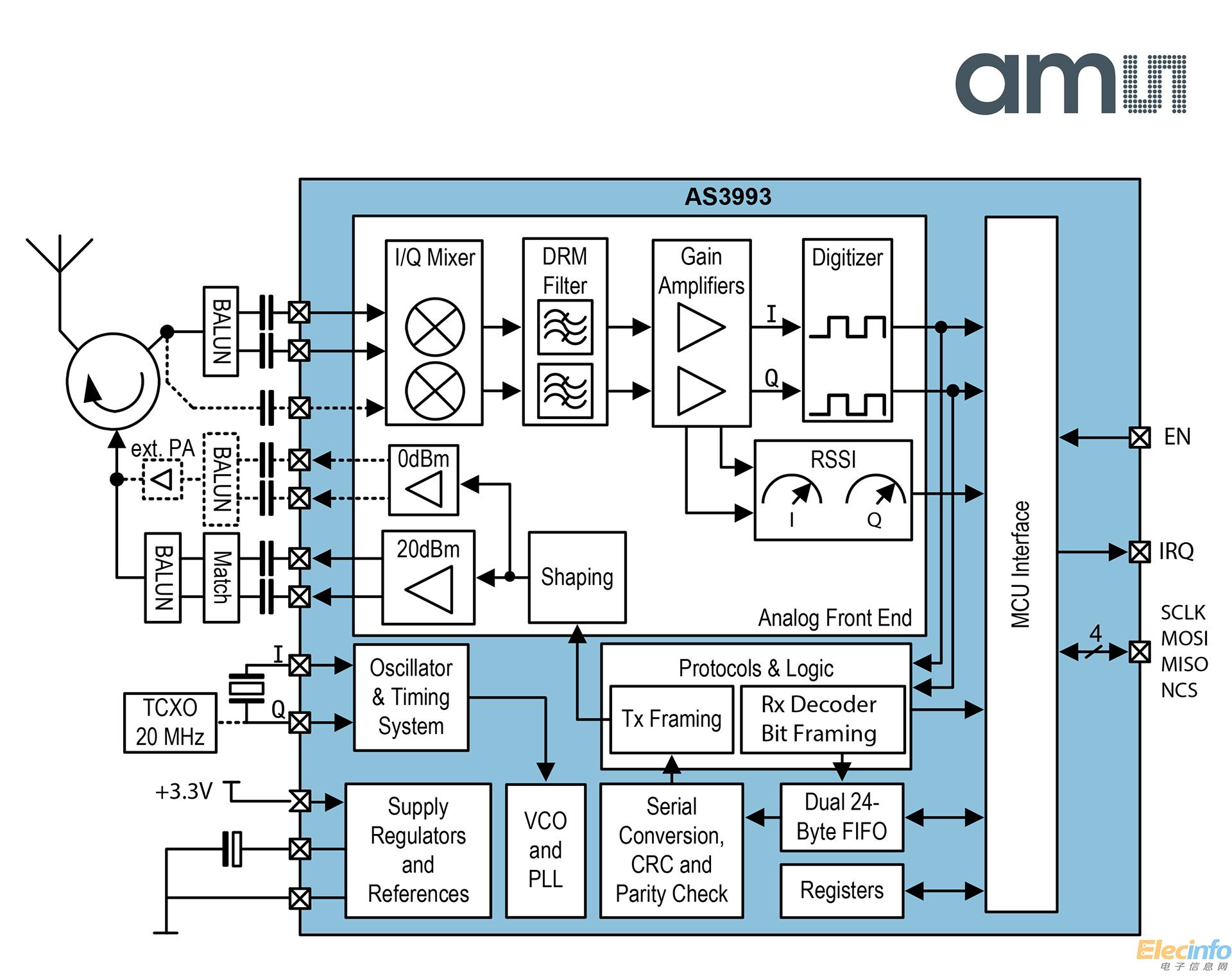 1153的開(kāi)發(fā)團(tuán)隊(duì)在初步設(shè)計(jì)階段所面臨的瓶頸來(lái)自性能、尺寸和功耗三方面的制約。Technology Solutions有限公司選用的AS3993來(lái)自艾邁斯半導(dǎo)體,采用緊湊的7mmx7mm QFN48封裝。該器件的運(yùn)行電壓可低至2.7V,并能兼容1153閱讀器中的1,130mAh鋰聚合電池。在正常運(yùn)作模式下,AS3993只需65mA的電流。