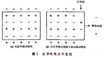 某些強介電物質(zhì)(PZT,LiTaO3等)的表面接受了紅外線的輻射能量,其表面產(chǎn)生溫度變化,隨著溫度的上升或下降,這些物質(zhì)表面上就會產(chǎn)生電荷的變化,這種現(xiàn)象稱為熱釋電效應(yīng)。圖1為晶體表面電荷隨溫度變化的移動情況。
