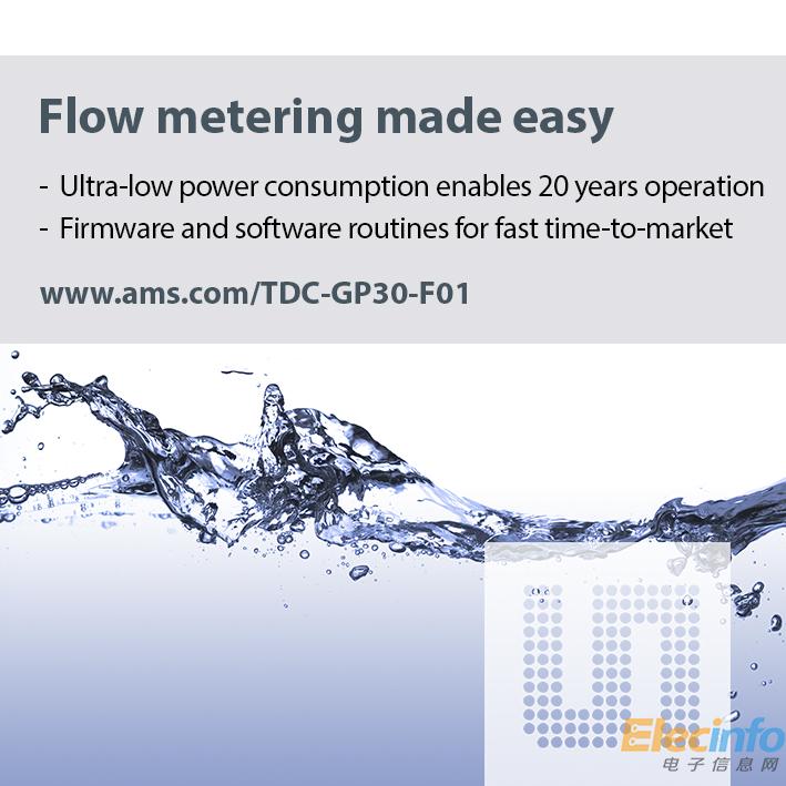 中國,2015年12月2日,全球領(lǐng)先的高性能模擬IC和傳感器供應(yīng)商艾邁斯半導(dǎo)體今日宣布推出TDC-GP30-F01以擴(kuò)展其超聲波流量計(jì)集成電路產(chǎn)品系列。TDC-GP30-F01是專為冷水表設(shè)計(jì)的完整硬件及固件測(cè)量解決方案。當(dāng)以8Hz的測(cè)量頻率進(jìn)行流量測(cè)量時(shí)僅需要8.5微安的直流電,從單個(gè)鋰電池上獲得的電量可使該芯片最長運(yùn)行20年。