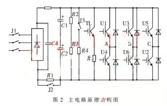 如圖2所示,TL、RL構(gòu)成泵升電壓吸收電路[5],當(dāng)電機負(fù)載進入制動狀態(tài)時,反饋電流將向中間直流回路電容充電,導(dǎo)致直流電壓上升。當(dāng)直流電壓上升到一定值時,控制TL導(dǎo)通,使這部分能量消耗在電阻RL上,確保變頻器可靠安全地工作。此外,由J1常閉觸點與R4 組成斷電能量釋放電路。當(dāng)系統(tǒng)發(fā)生故障或關(guān)機時,繼電器J1斷電,通過其常開觸點,將變頻器與電網(wǎng)斷開;而常閉觸點閉合,利用R4為中間回路大電容所儲存的能量提高釋放通道。