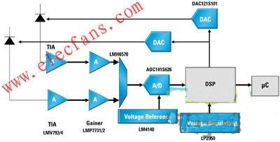 反補(bǔ)償運(yùn)算放大器最適合使用在電流-電壓轉(zhuǎn)換(跨阻)電路。在醫(yī)療儀器中,其中一個最普遍的應(yīng)用是測量血細(xì)胞中的含氧量,稱為SPO2或飽和或外圍氧氣。圖1所示為SPO2模塊的框圖,當(dāng)中的反補(bǔ)償放大器(TIA)用來將來自光二極管的電流轉(zhuǎn)化成電壓。
