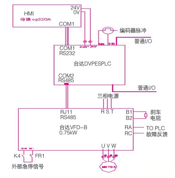 plc作為控制的核心,主要用來接收編碼器的反饋信號實現對當前位置的檢測,通過和設定值的比較用通訊功能來控制變頻器的輸出頻率從而實現精確定位。同時通過hmi可以方便的設定plc的一些內部寄存器值進行人機交互,并且變頻器的工作頻率可以在hmi上方便修改和直觀顯示。臺達的dvp系列plc都具有兩個通訊口,com1是 rs232,com2是rs485,支持modbus ascii/rtu通訊格式,通訊速率最高可達115200bps,兩通訊口可以同時使用。所以無需用任何擴展模塊就可以實現既可連接用于參數設置的人機界面又可用通訊的方式控制變頻器等其它設備。并且dvp系列plc提供了針對modbus ascii/rtu模式的專用通訊指令,這樣在編寫通訊程序時就可以大大簡化,無需像用串行數據傳送指令rs那樣要進行復雜的校驗碼計算和遵循復雜的指令格式。臺達的vfd系列變頻器內建有單獨的rs-485串聯通訊界面,并且也遵循modbus ascii/rtu通訊格式(vfd-a系列除外)?;c這些特點選用了性價比優(yōu)異的dvp es plc和vfd-b變頻器。整個系統(tǒng)的結構圖如圖1所示。