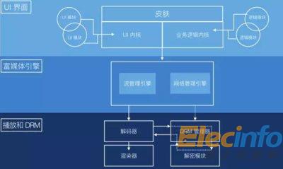 用戶界面(UI):這是播放器最上層的部分。它通過三部分不同的功能特性定義了終端用戶的觀看體驗:皮膚(播放器的外觀設(shè)計)、UI(所有可自定義的特性如播放列表和社交分享等)以及業(yè)務(wù)邏輯部分(特定的業(yè)務(wù)邏輯特性如廣告、設(shè)備兼容性邏輯以及認(rèn)證管理等)。