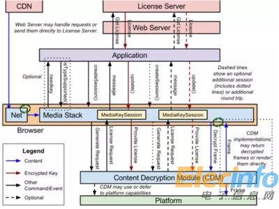 為了標(biāo)準(zhǔn)化 DRM 以及為各平臺的實現(xiàn)提供一定的互通性,幾個 Web 巨頭一起創(chuàng)建了通用加密標(biāo)準(zhǔn)Common Encryption (CENC)  和通用的多媒體加密擴展Encrypted Media Extensions,以便為多個 DRM 提供商(例如,EME 可用于 Edge 平臺上的 Playready 和 Chrome 平臺上的 Widewine)構(gòu)建一套通用的 API,這些 API 能夠從 DRM 授權(quán)模塊讀取視頻內(nèi)容加密密鑰用于解密。