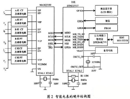 計量芯片選用Maxim生產(chǎn)的多功能低功耗計量芯片MAXQ3180,主機選用ST公司生產(chǎn)的STM32F107xx增強型ARM嵌入式控制器。由于STM32F107只具有10/100 Ethernet MAC,所以需外加10/100 Mb/s以太網(wǎng)物理層收發(fā)器DP83848CVV和RJ45連接器J0011D21B。這樣,智能電表可提供一個以太網(wǎng)通信接口,便于組成分布式通信網(wǎng)絡。