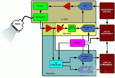 在發(fā)射端(Tx路徑),波束成形器確定了延遲模式和脈沖序列,其是專為所需的焦點(diǎn)而設(shè)定的。然后,驅(qū)動(dòng)傳感器的高壓發(fā)射放大器將波束成形器的輸出放大。這些放大器可由數(shù)模轉(zhuǎn)換器(DAC)或者高壓FET開關(guān)陣列控制,將發(fā)射脈沖整形,以便較好的將能量傳遞到傳感器單元。而在接收端,發(fā)射/接收(T/R)開關(guān)(通常是二極管電橋)阻擋Tx高壓脈沖。在某些陣列中使用高壓(HV)多路復(fù)用器/多路分離器減少發(fā)射和接收硬件的復(fù)雜度,但是這犧牲了靈活性。