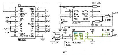 MAX4471是MAXIM公司的一款低功耗的放大器。MAX9028是MAXIM公司的一個(gè)低功耗的比較器。濾波電路采用MAX267構(gòu)成帶通濾波器(允許0.8~38Hz的信號(hào)通過(guò)),濾掉信號(hào)中的直流成分和電源以及皮膚與袖帶摩擦的高頻噪聲和工頻干擾,然后經(jīng)過(guò)MAX4471進(jìn)行進(jìn)一步放大,得到單片機(jī)匹配的電壓信號(hào),進(jìn)入ADC2,監(jiān)視血壓的交流分量。同時(shí)該信號(hào)通過(guò)低功耗比較器MAX9028轉(zhuǎn)換成脈沖信號(hào),觸發(fā)ADC1工作。