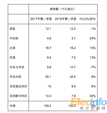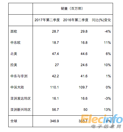 全球智能手機2017年第二季度銷售總量達到3.47億部,同比增長4%,創(chuàng)下第二季度歷史新高。亞洲新興地區(qū)以同比13%的增幅引領增長,中東歐地區(qū)和拉美地區(qū)分別以同比增長11%和10%位居其后。由于平均售價增長,全球智能手機市場的銷售額同比增長9%。