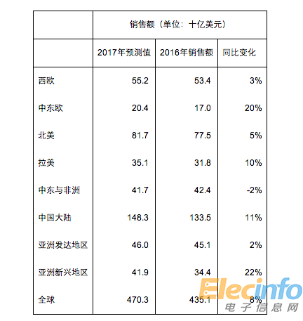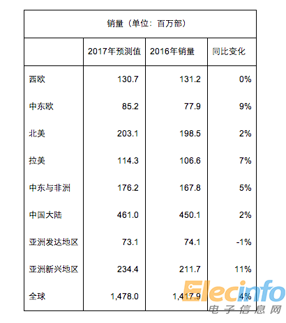 智能手機:2017年銷售預測值與2016年銷售情況