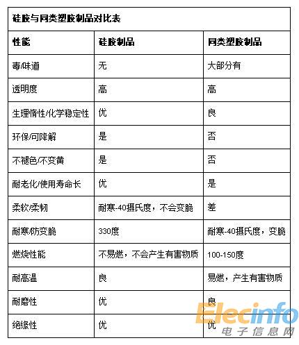 從上面表格中看出,原來硅膠的性能比其他塑膠產(chǎn)品優(yōu)秀很多。