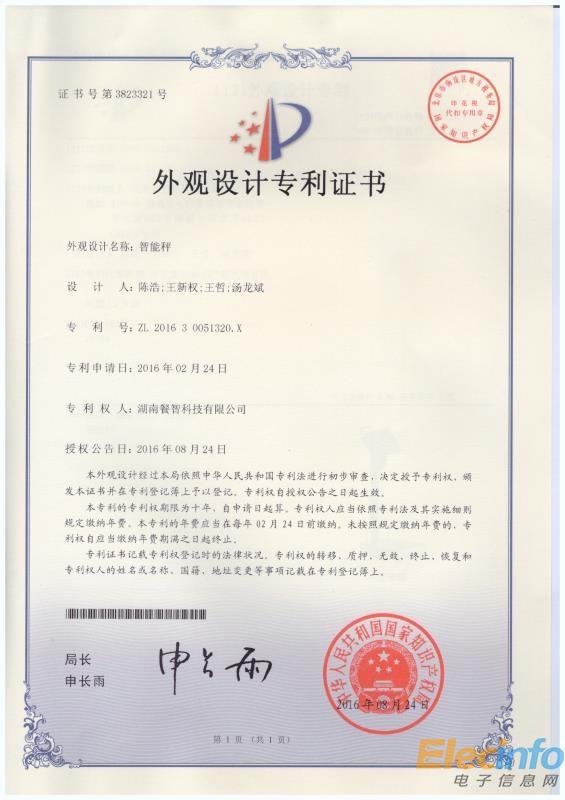 餐鏈智能秤2016年2月申請外觀設(shè)計(jì)專利成功