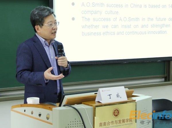 “強(qiáng)調(diào)以科技技術(shù)創(chuàng)新為核心、重視價(jià)值觀推動(dòng)與人力資源,以及一系列行之有效的制度和方法 -- 這就是美國 A.O.史密斯集團(tuán)能夠在全球家電領(lǐng)域屹立百年不倒的創(chuàng)新成功之道。”在日前于北京大學(xué)國家發(fā)展研究院舉行的一次研討會(huì)上,面對南南合作與發(fā)展學(xué)院的數(shù)十名發(fā)展中國家博士、碩士,美國 A.O.史密斯集團(tuán)高級副總裁兼中國公司總裁丁威將自己20年來工作中的經(jīng)驗(yàn)與體會(huì)進(jìn)行了精彩的分享,令所有在場者獲益匪淺。