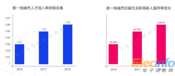 與此同時(shí),以杭州、西安、武漢、成都、南京為代表的15個(gè)“新一線”城市在去年陸續(xù)出臺(tái)人才吸引政策后,政策已初顯成效。2018年一季度,新一線城市人才流入率(流入人數(shù)/流出人數(shù))為1.07,較2016年增長(zhǎng)3.2%。 2018年一季度,從新一線城市高校畢業(yè),之后留在當(dāng)?shù)毓ぷ鞯穆殘?chǎng)新人比例達(dá)73.8%(包括應(yīng)屆生和工作經(jīng)驗(yàn)一年以下的求職者), 較2016年增加近20個(gè)百分點(diǎn)。